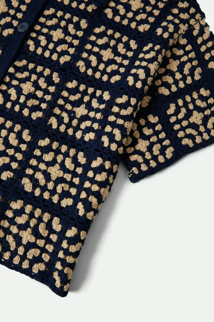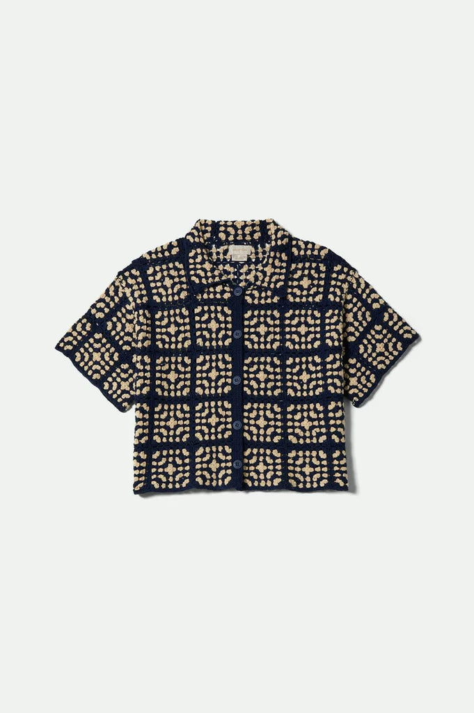 Keep it breezy and ultra-stylish this summer with the Crochet Short Sleeve Button Down. This lightweight, breathable cotton crochet top is truly handcrafted, featuring an intricate indigo and off-white pattern for a vintage-inspired look that stands out. It's made in a laid-back camp collar button-down style with short sleeves, making it easygoing and eye-catching. This isn't just a top; it's your perfect warm-weather essential for staying on-trend while keeping cool.