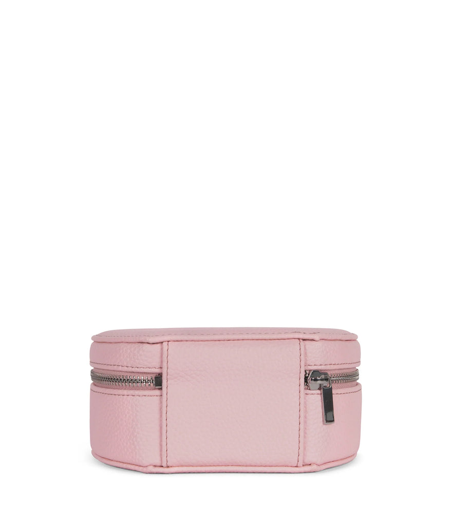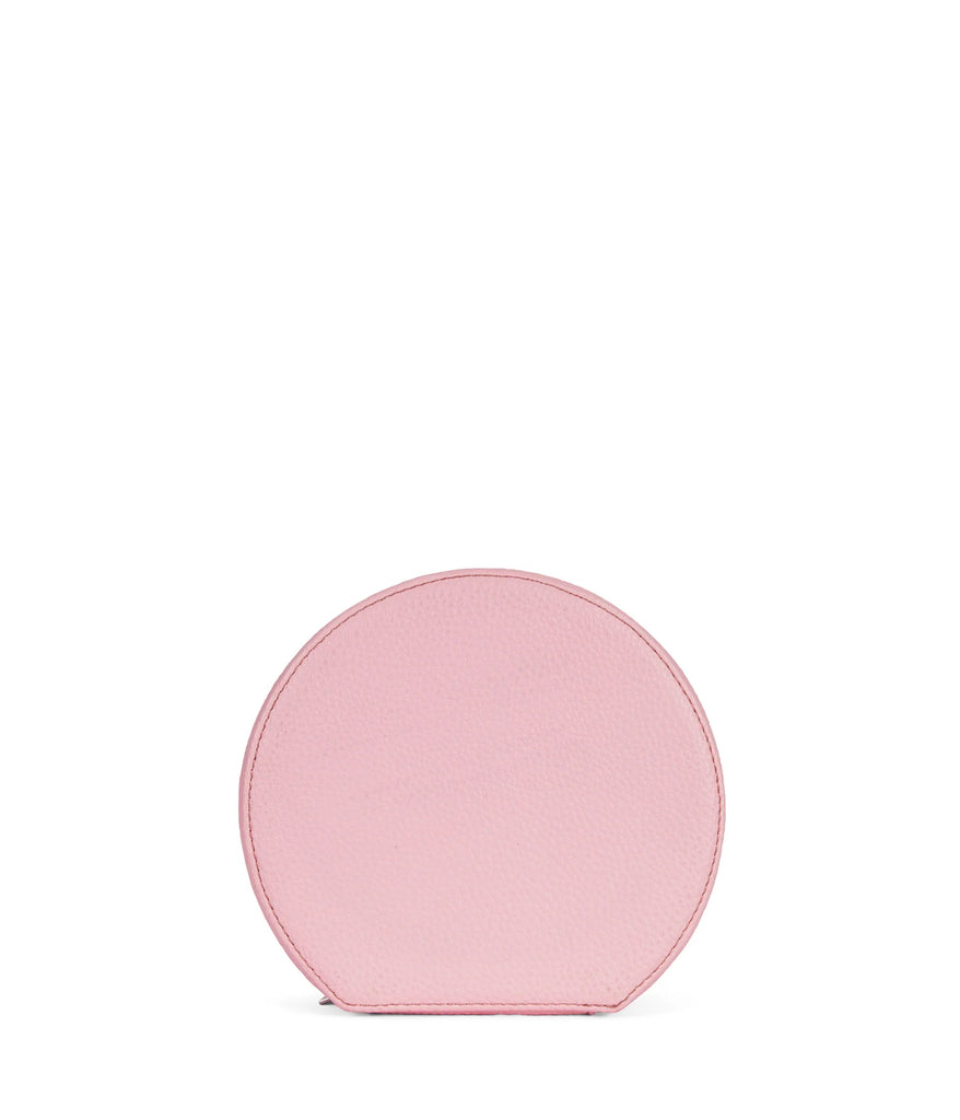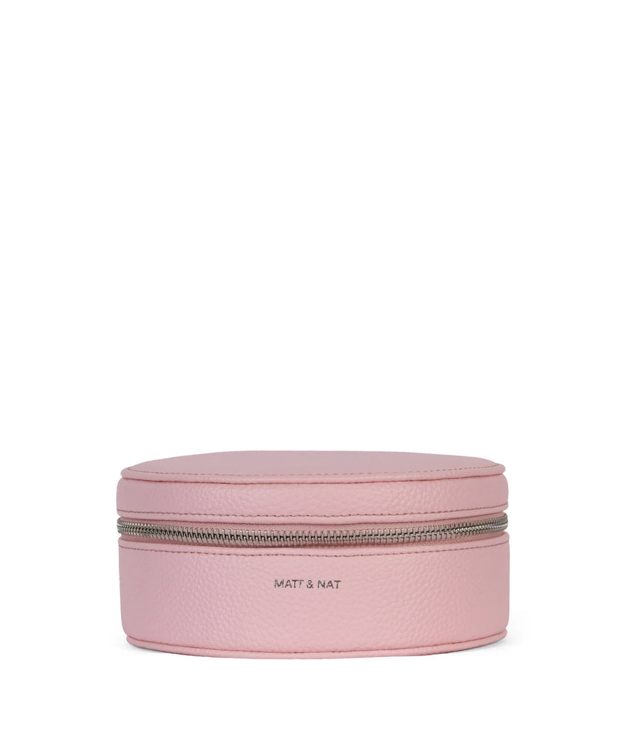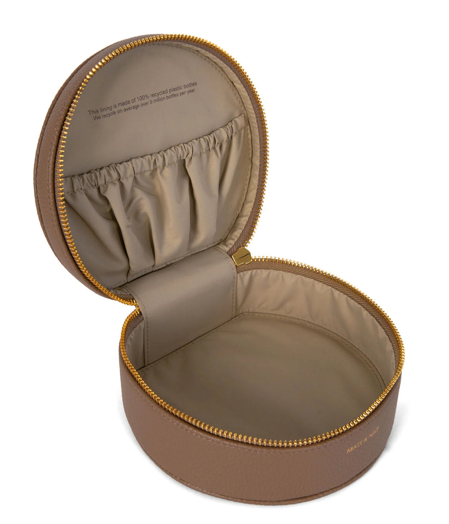 A round vanity case with a zipper closure.