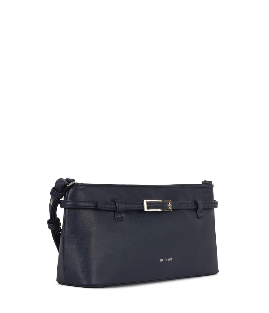 Clutch with a belt detail around the top, a zipper closure, and a removable crossbody strap.