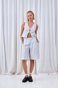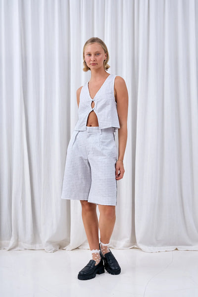 Crafted from our 100% linen grid weave, these trouser shorts are truly the best vibe. Featuring a hook and zipper closure with front pleats + out favourite detail, a black side piping pinstripe.