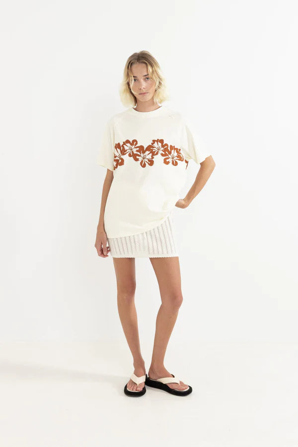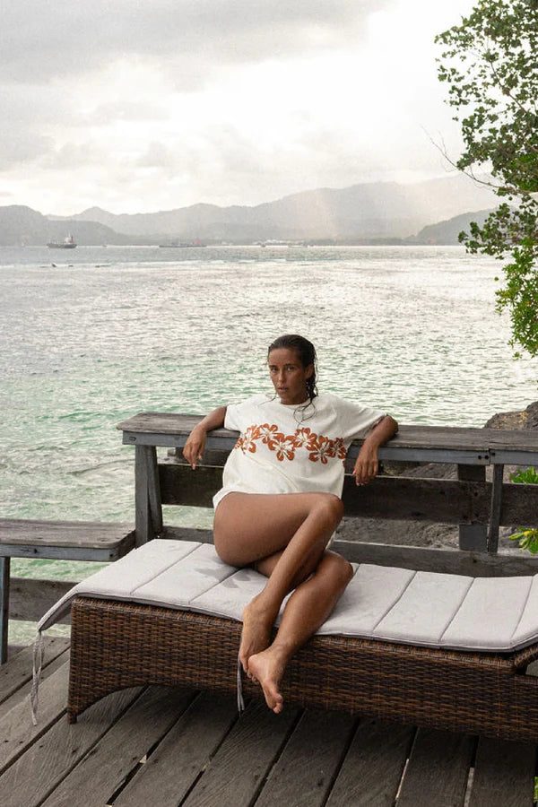 With soft cotton and a relaxed fit, this vintage-inspired tee features screen-printed artwork at the chest and back. Its earthy clay color and oversized design make it a comfortable yet stylish choice for coastal living.